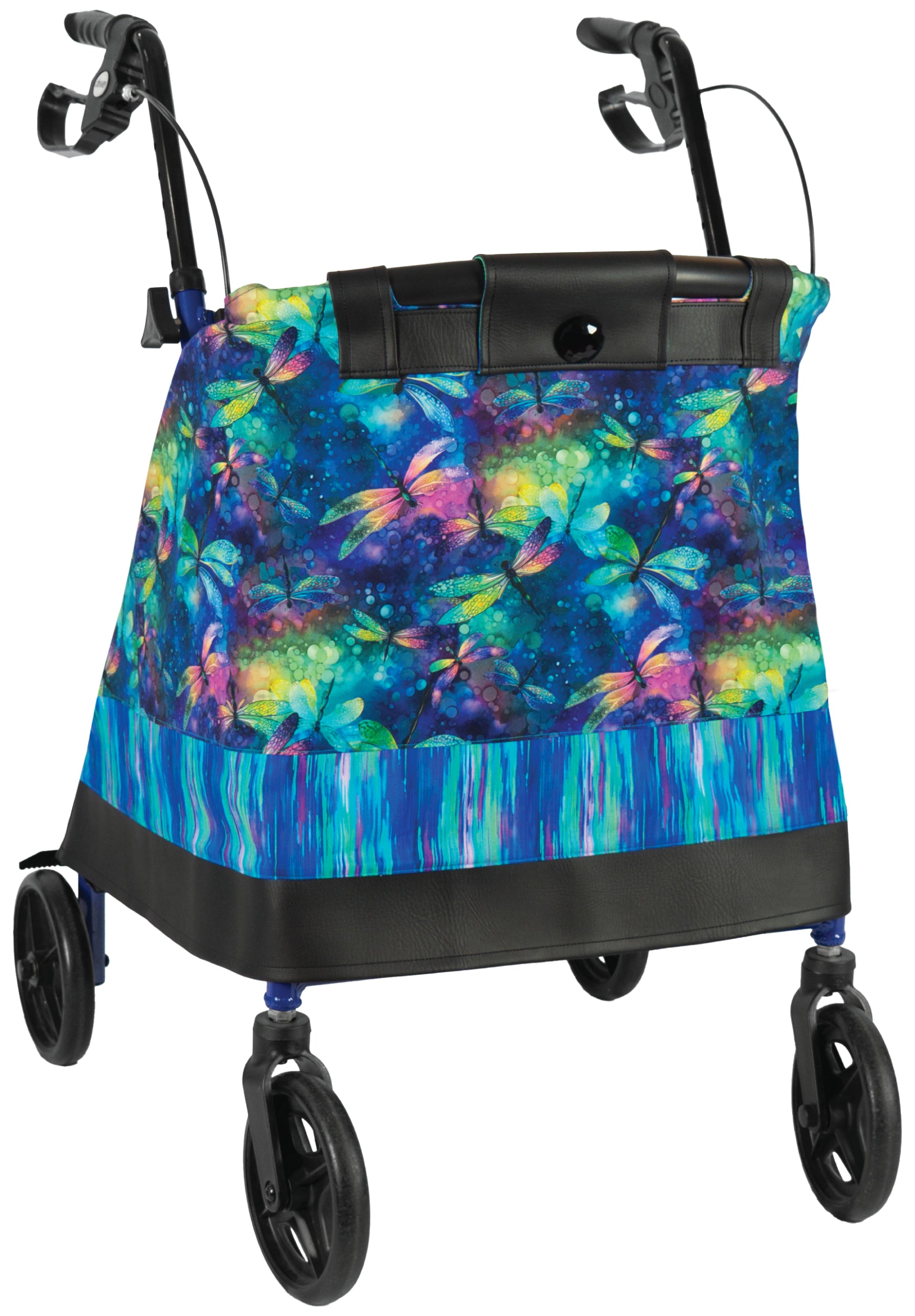 A WrapHapeez is a patented all-in-one rolling walker wrap that turns a plain, industrial-looking rolling walker into a vibrant and stylish extension of the user, while also adding functionality.
